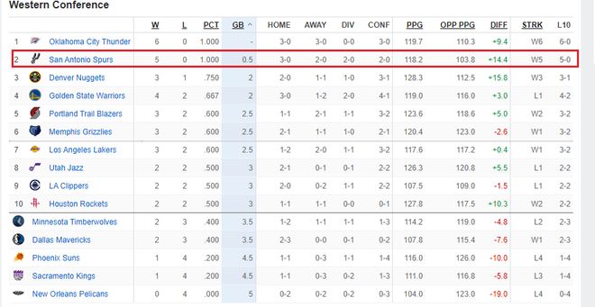 最好的马刺还没有来到。一旦福克斯、索汉和科内特恢复健康,马刺的阵容更加完善。当然,马刺取得5连胜与开局赛程相对轻松有一定的关系。他们击败的对手分别是独行侠、鹈鹕、篮网、猛龙和热火,还没有出现争冠级别的超级劲旅。所以,马刺青年军还得冷静,他们离迈进争冠行列,还有一段路要走。他们目前是西部的头号黑马,5胜0负位居西部第二,正在冲击西部格局,使得西部局势更混乱了。